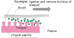 By dragging the head of the cleaner over the tongue, fur and plaque that has gathered in the indentations of the tongue is removed by the squeegee.